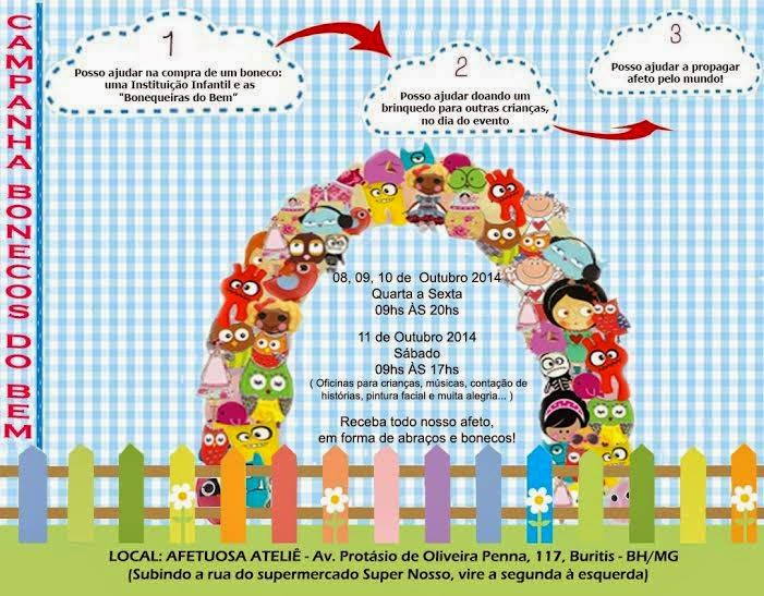 A Campanha Bonecos do Bem terá sua 1ª Edição, de 08 a 11 de Outubro, no Afetuosa Ateliê (Anota aí o endereço) e você pode fazer parte deste movimento do Bem. É só adquirir produtos da Campanha, parte da renda arrecadada com as vendas será destinada à intervenções sociais no CAIS – Centro de Atendimento de Inclusão Social de Contagem / MG.